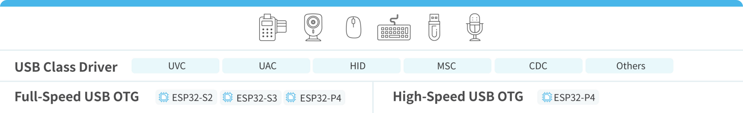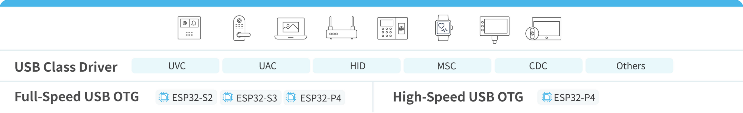 USB (Universal Serial Bus) is a standard set of connectivity specifications enabling communication between various external devices and a host controller. Espressif’s USB Solutions provide users with a convenient and efficient way for device interconnection and data transmission. The ESP32-S, ESP32-C, and ESP32-P series of SoCs incorporate USB as one of their standard peripheral devices, providing USB 2.0 OTG (On-The-Go) and/or USB-Serial-JTAG interfaces for both Host and Device modes. This offers users a variety of USB Host solutions, such as doorbell cameras, 4G IoT gateways, electronic photo albums, and attendance machines, as well as USB Device solutions, namely peripherals, such as a keyboard, mouse, USB flash drive, microphones, etc.